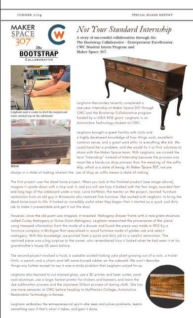 Leighann Hernandez completed a one-year internship at Maker Space 307 through Central Wyoming College and the Bootstrap Collaborative, supported by a USDA RISE grant. As an Automotive Technology student, she brought strong technical skills, creativity, and problem-solving to a wide range of hands-on projects—from restoring century-old furniture to using advanced tools like 3D printers and laser cutters. Her ability to take initiative and learn new skills made her an invaluable part of the team. This internship is a great example of how collaboration between students, mentors, and local programs creates real-world learning and lasting impact.